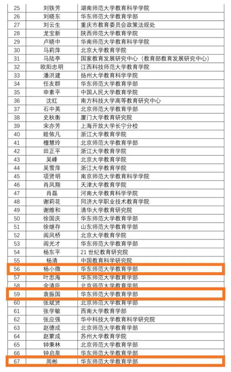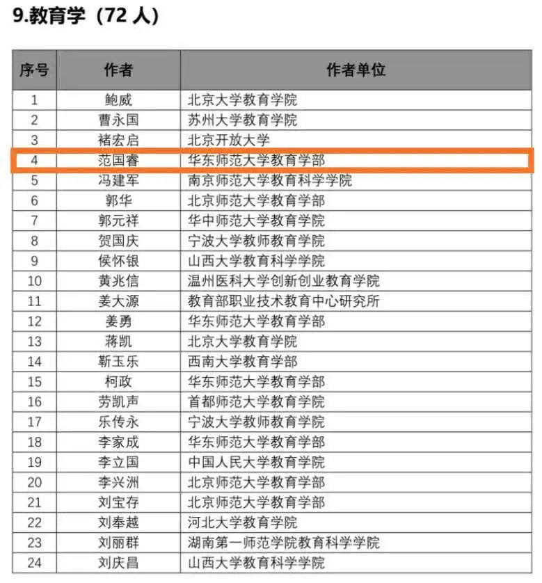 近日,中国人民大学社会科学学术成果评价研究中心联合中国人民大学书报资料中心发布《复印报刊资料重要转载来源作者(2019版)》名单,各学科总计入选作者880位。教育学有72位,其中华东师范大学教育学部有13位作者入选,位列全国第一。在这13位作者当中,教育学系范国睿、杨小微、袁振国、周彬四位教授入选。